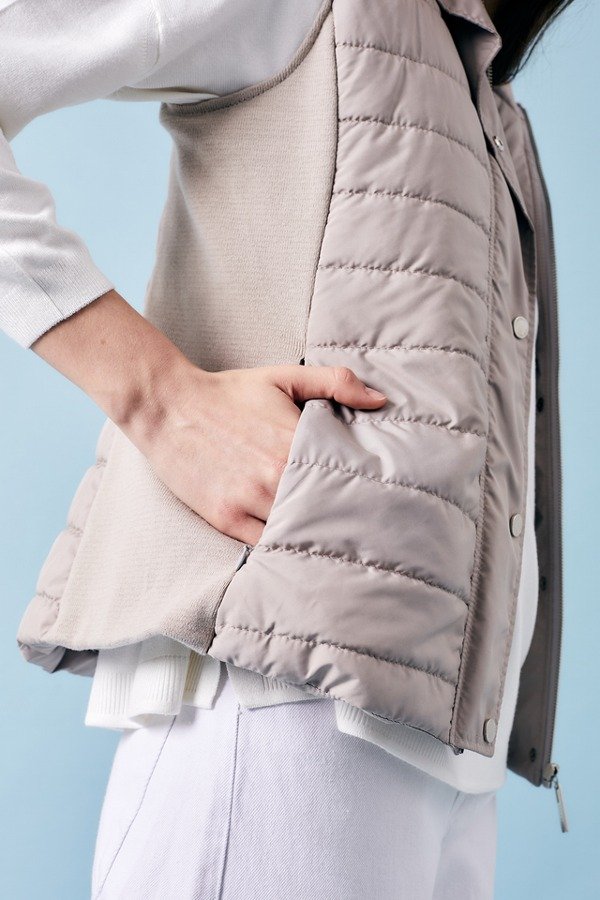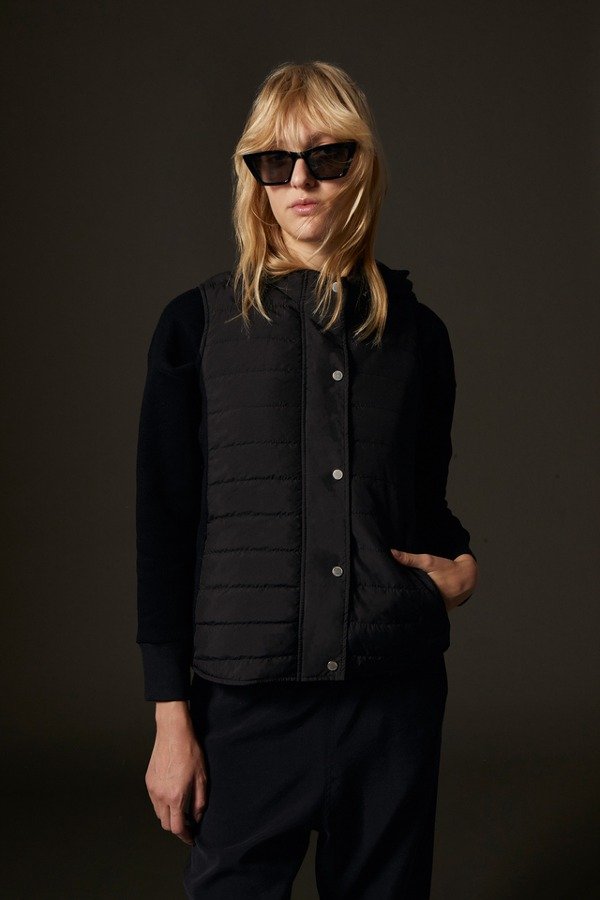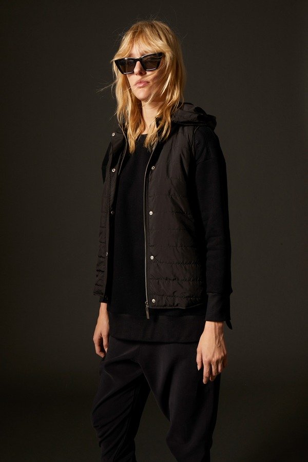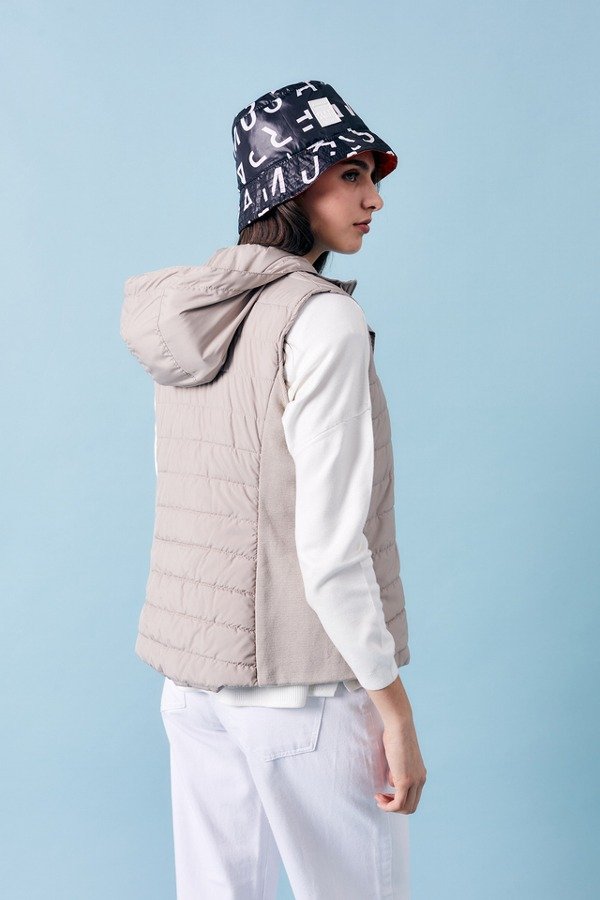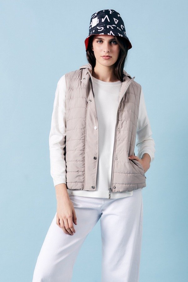 Chaleco matelaseado.- Acceso por cartera con cierre y broches.- Matelase baston.- Costadillo tejido.- Bolsillos con cierres invisibles.- Capucha desmontable por medio de cierre.- Bolsillo interno con cierre.- Interior con detalle bordado.